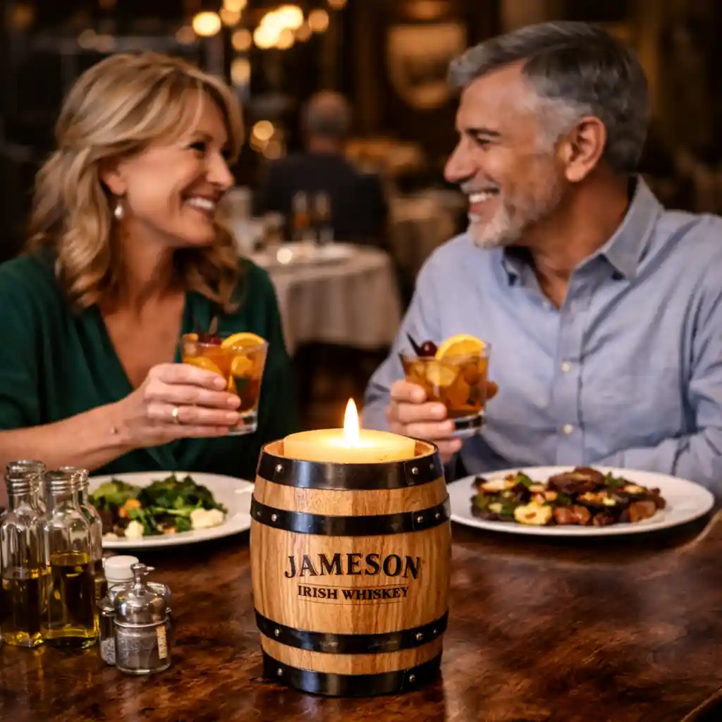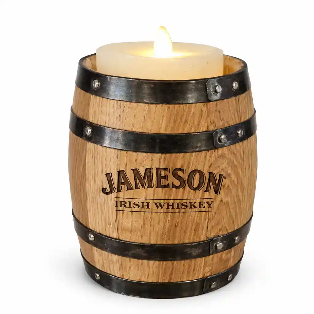 The Custom Branded Oak Barrel Candle Holder is a premium promotional product designed to put your distillery or whiskey brand front and center where it matters most — on the bar and at the table.